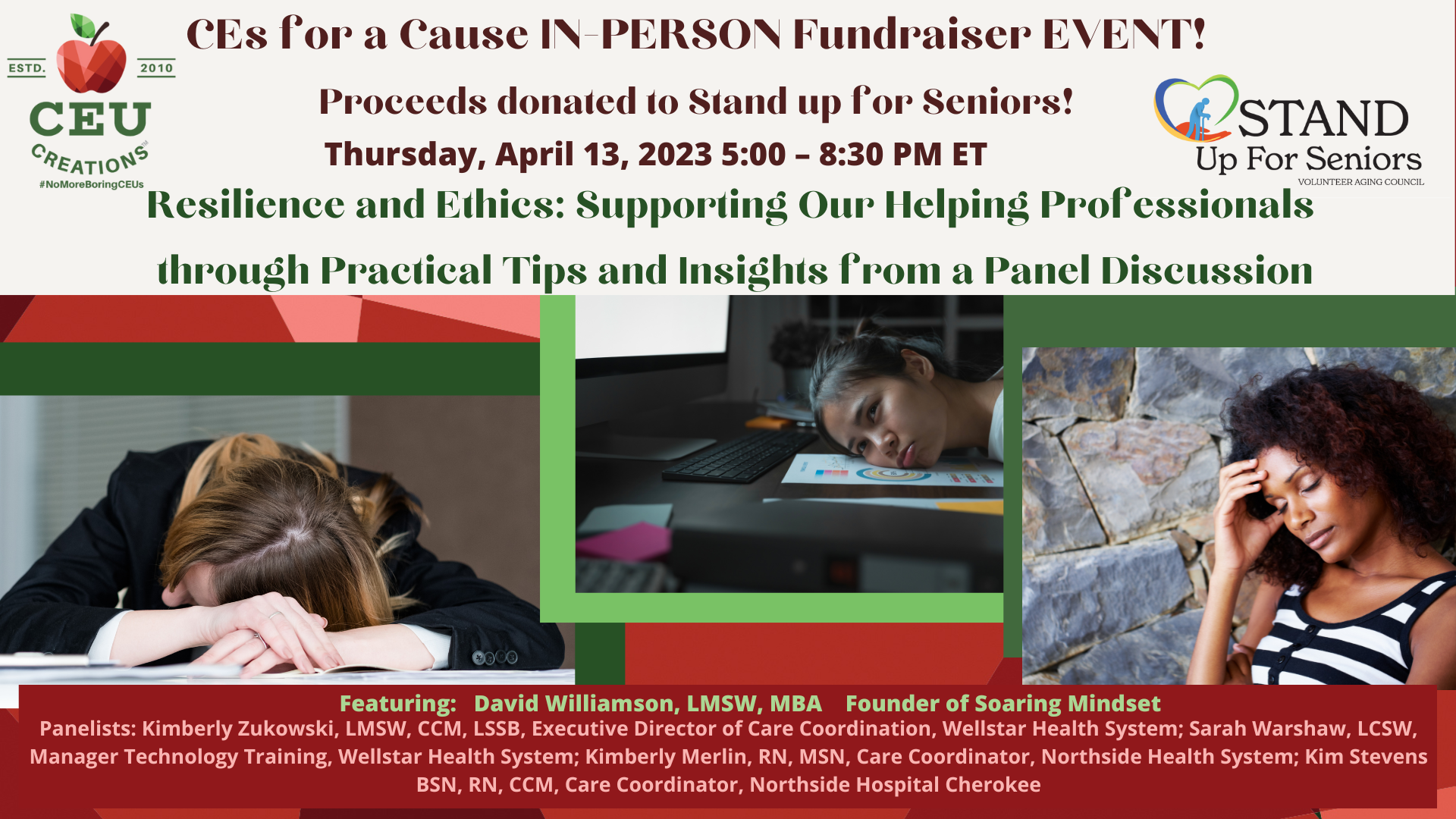 Date: Thursday, 4/13/23 Time: 5:00 p.m. - 8:30 p.m. ET Fundraiser Event for Stand up For Seniors Location: In Person Event! Holbrook Woodstock 13682 Hwy 92 Woodstock, GA Cost: Registration: $25.00 100% of registration fees go to Stand up for Seniors Seats are limited! Credits: 2 CE credits! |