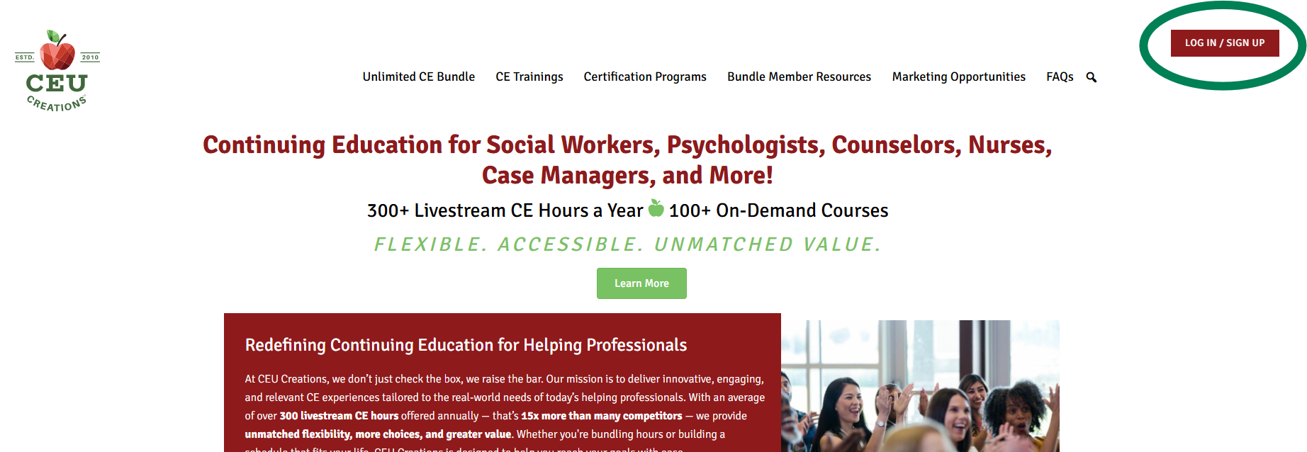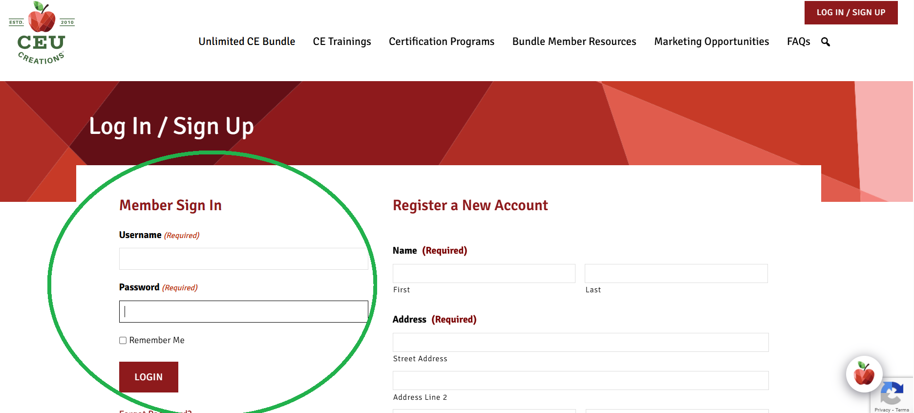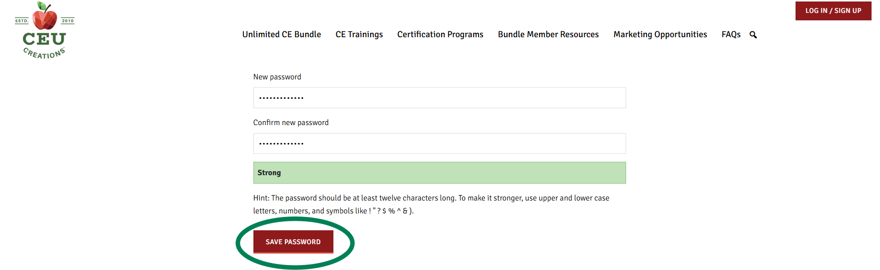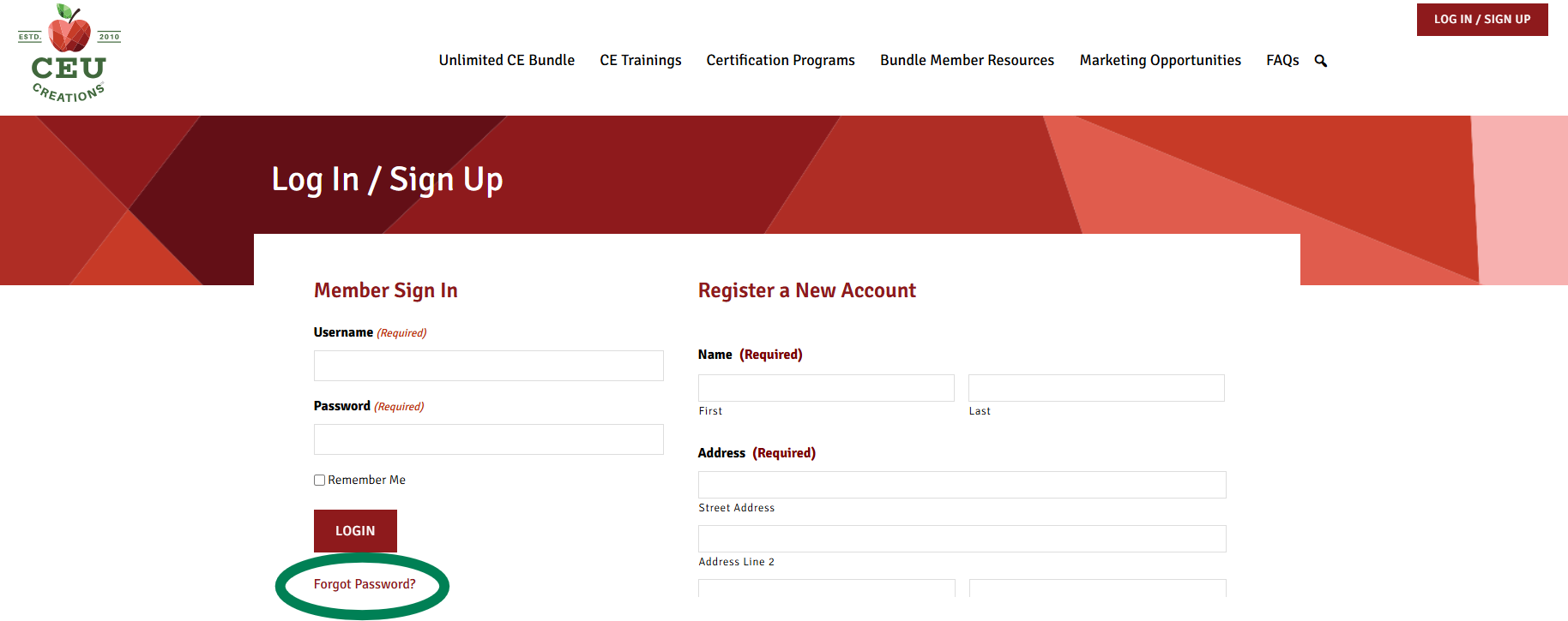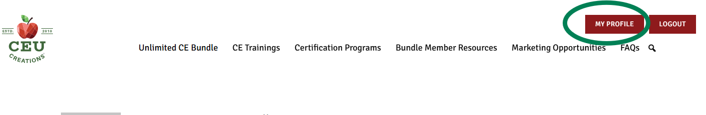 Go to the CEU Creations website CEUCreationsinc.com and click the “Log In/Sign Up” button in the top right corner.