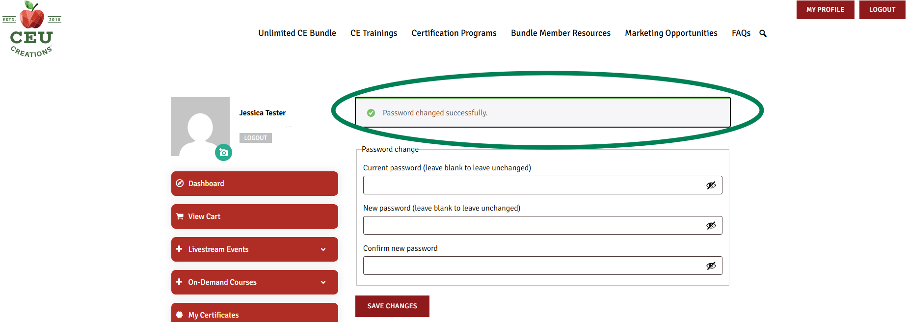 After you have successfully changed your password you will be brought to the same screen with a message confirming your change was successful. You can now continue to navigate the site.
